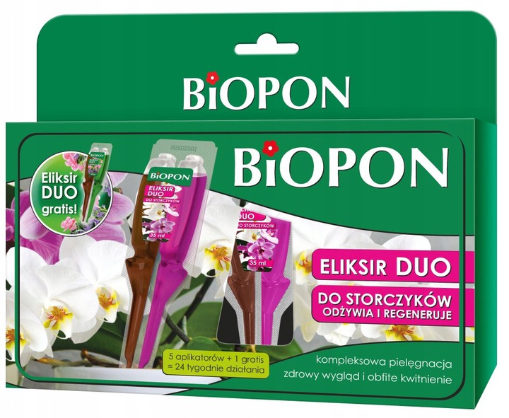 Biopon Eliksir Duo to bardzo innowacyjny, dwuskładnikowy środek przygotowany do nawożenia i szybkiej regeneracji wszystkich rodzajów storczyków.