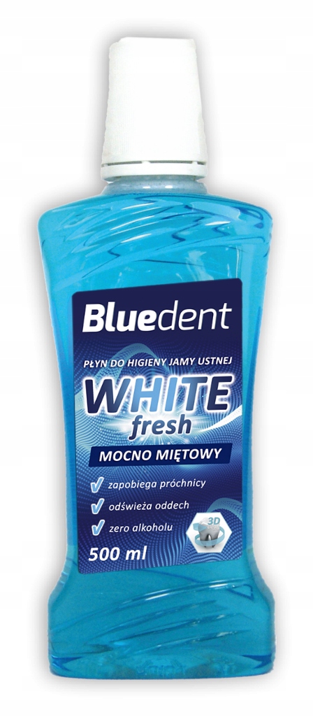 Płyn Bluedent zapewnia kompleksową ochronę jamy ustnej. Czyści i chronią zęby oraz dziąsła. Działa delikatnie wybielająco (efekt 3D).