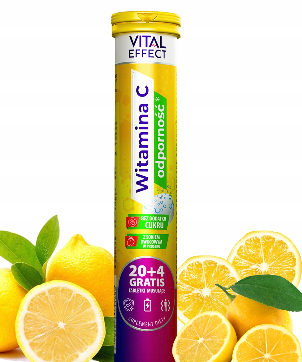 Witamina C to podstawa odporności! VITAL EFFECT to silna dawka 1000 mg witaminy C w wygodnej formie musującej. Idealna w sezonie przeziębień i osłabienia. Wzbogacona o naturalne aromaty, bez cukru.
